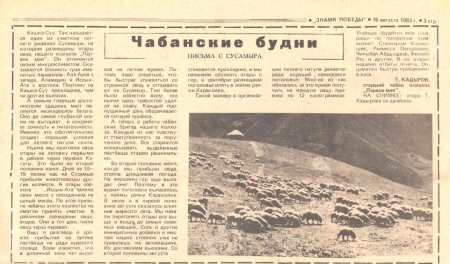 Tuesday, 23 March 2021 14:46 Чабанские будни Additional Info Document name: Чабанские будни Author name: Жениш Туусу Year of publishing: 1980 Document type: Newspapers Represented by: Chui Oblast Library Read 522 times More in this category: « С кукурузных плантаций Двойная отдача сада » back to top