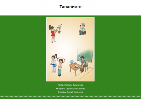Дүйшөмбү, 24 Апрель 2023 12:44 Танаписте Кошумча маалымат Ысым: Танаписте Жазуучу: Назгуль Кулматова Түзүү жыл: 2023 Документ түрү: Китептер Жөнөтүүчү: К. Баялинов атындагы республикалык балдар жана жаштар китепканасы Окуу 561 раз Другие материалы в этой категории: « Марстан келген белек Эльфийкалык Элифанын кызыктуу окуялары » Тепкич менен жогору