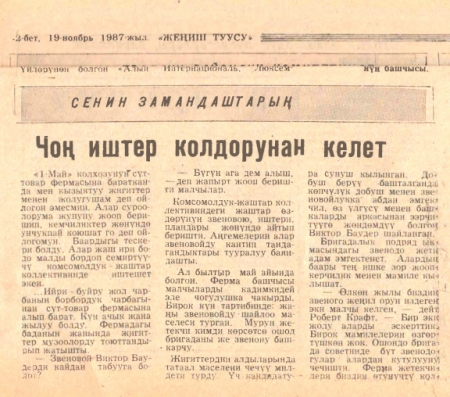 Четверг, 18 марта 2021 14:47 Чоң иштер колдорунан келет Дополнительная информация Название: Чоң иштер колдорунан келет Автор: Т.Моргунова Год издания: 1980 Тип документа: Газеты Представлено: Чуйская областная библиотека Прочитано 741 раз Другие материалы в этой категории: « Совхоздук новатор Иш кубаныч тартуулаганда » Наверх