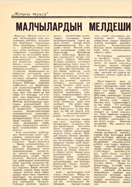 Вторник, 23 марта 2021 13:40 Малчылардын мелдеши Дополнительная информация Название: Малчылардын мелдеши Автор: Жениш Туусу Год издания: 1980 Тип документа: Газеты Представлено: Чуйская областная библиотека Прочитано 733 раз Другие материалы в этой категории: « Чабандын төл өнөктүгү Чабанская династия » Наверх