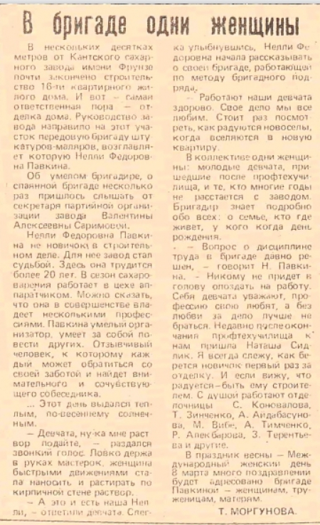 Вторник, 23 марта 2021 15:49 В бригаде одни женщины Дополнительная информация Название: В бригаде одни женщины Автор: Жениш Туусу Год издания: 1980 Тип документа: Газеты Представлено: Чуйская областная библиотека Прочитано 699 раз Другие материалы в этой категории: « Мастер Колхоз "Заветы Ленина" » Наверх