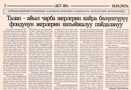 - Название: Талап-айыл чарба жерлерин кайра бөлүштүрүү фондунун жерлерин натыйжалуу пайдалануу