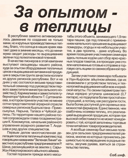 Пятница, 02 апреля 2021 12:14 За опытом-в теплицы Дополнительная информация Название: За опытом-в теплицы Автор: Жениш Туусу Год издания: 2017 Тип документа: Газеты Представлено: Чуйская областная библиотека Прочитано 737 раз Другие материалы в этой категории: « "Медицинский врач лечит человека, а ветеринарный врач-человечество" У памяти должны быть имена » Наверх