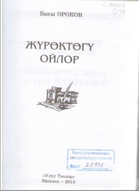 Среда, 23 сентября 2020 23:21 Жүрөктөгү ойлор Дополнительная информация Название: Жүрөктөгү ойлор Автор: Бакы Ороков Год издания: 2015 Тип документа: Книги Представлено: Жалал-Абадская областная библиотека Прочитано 1114 раз Другие материалы в этой категории: « Жомоктон соң Карбоз ата жана бабалары » Наверх